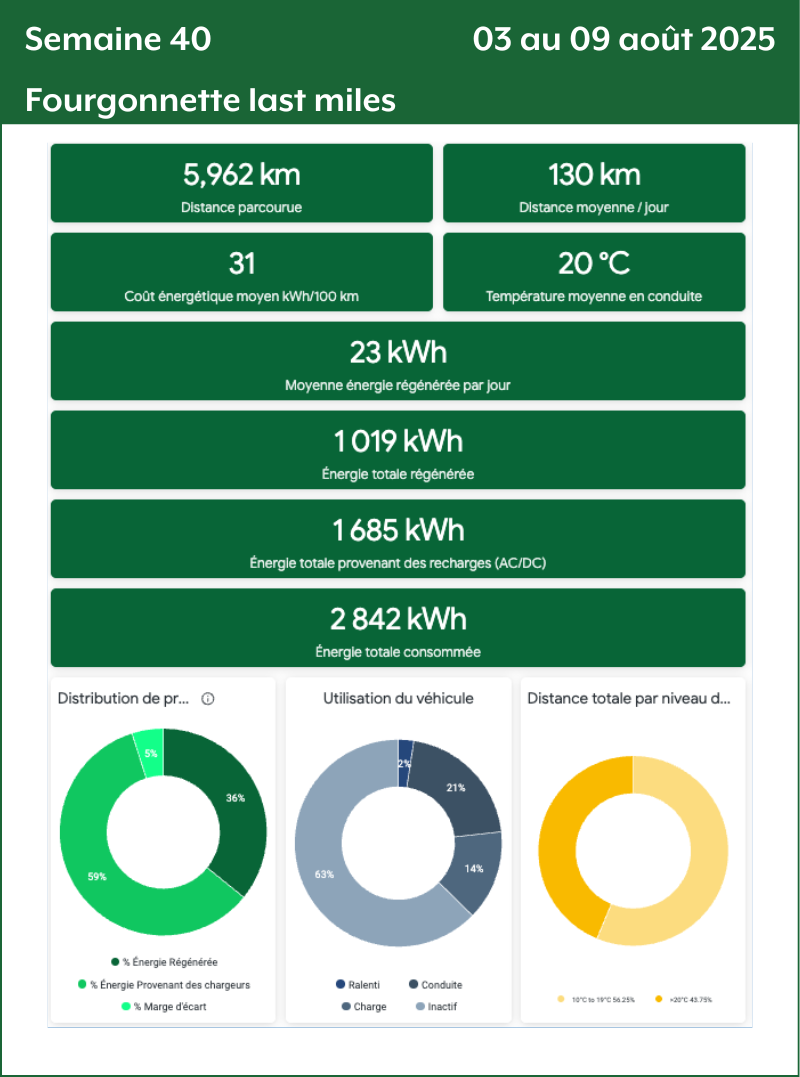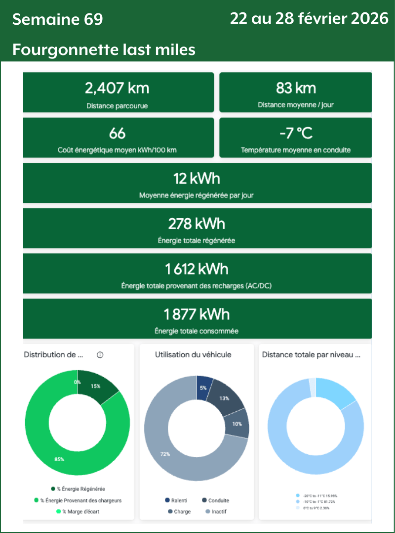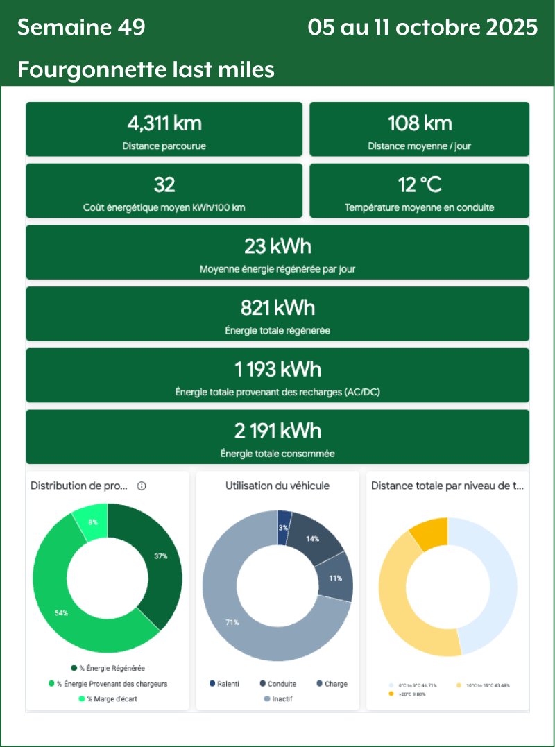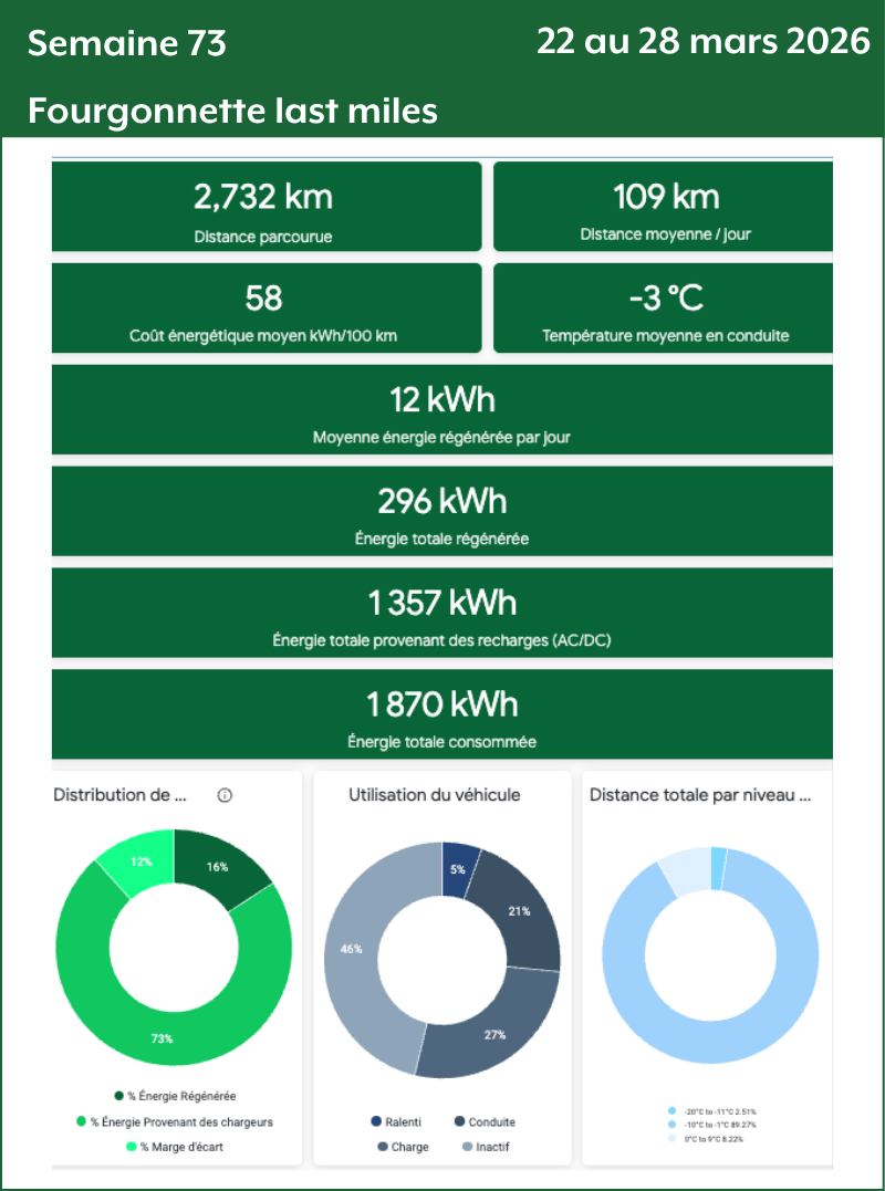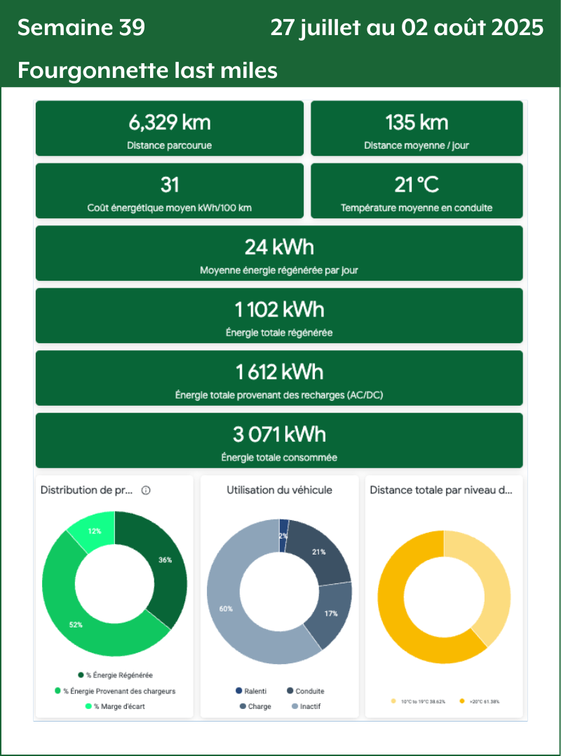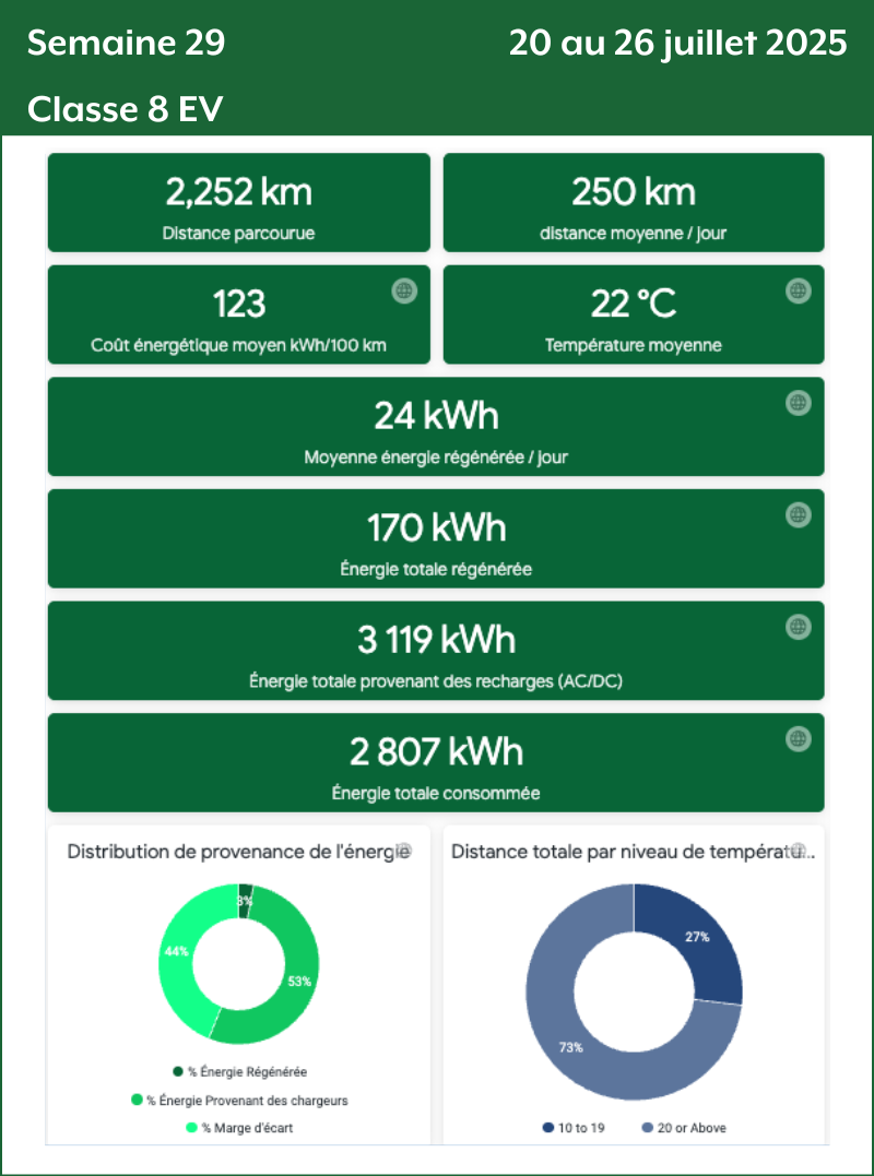 - Distance totale par niveau de température : Le nombre de kilomètres parcourus par tiers de température. Plus le nombre de kilomètres est grand plus la donnée de consommation va être précise et fiable.