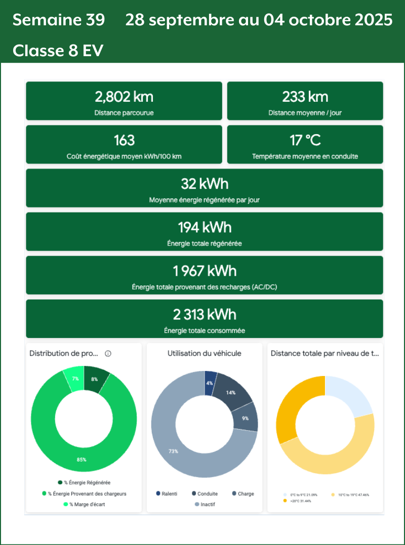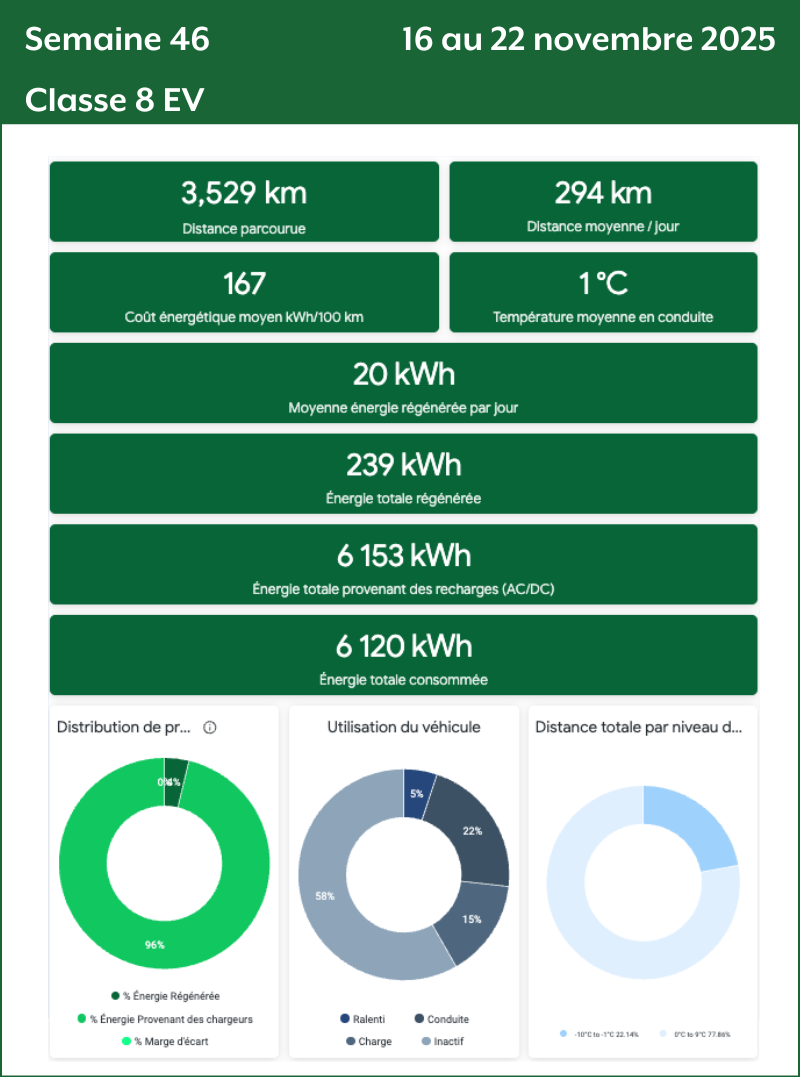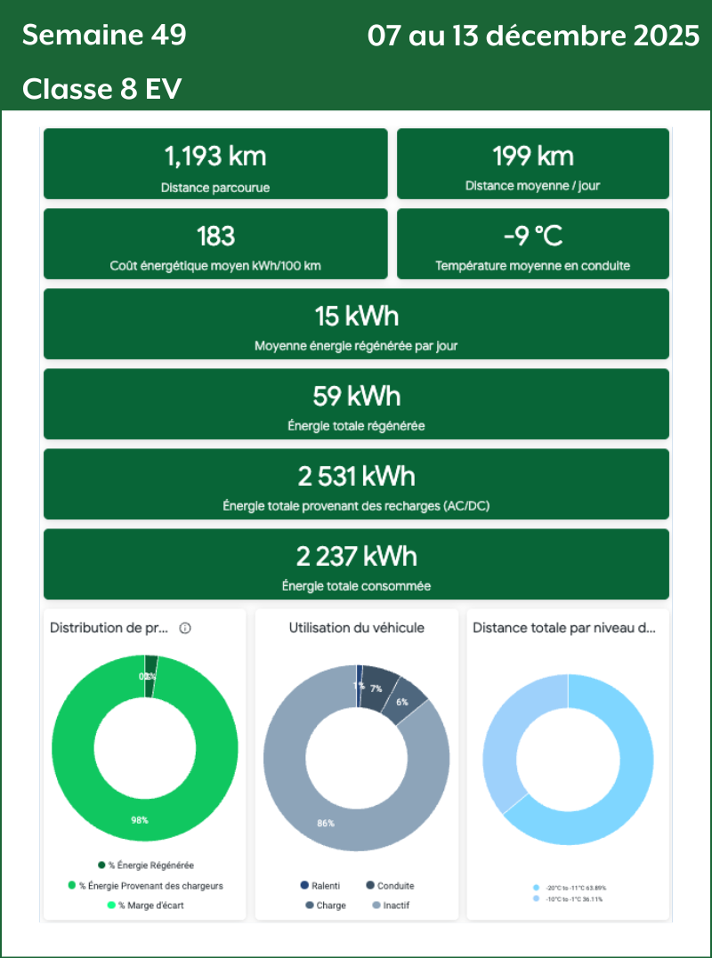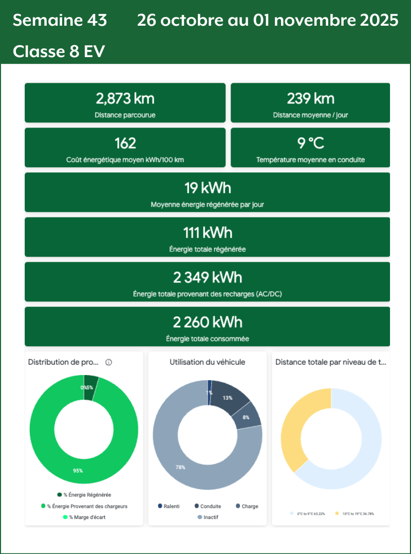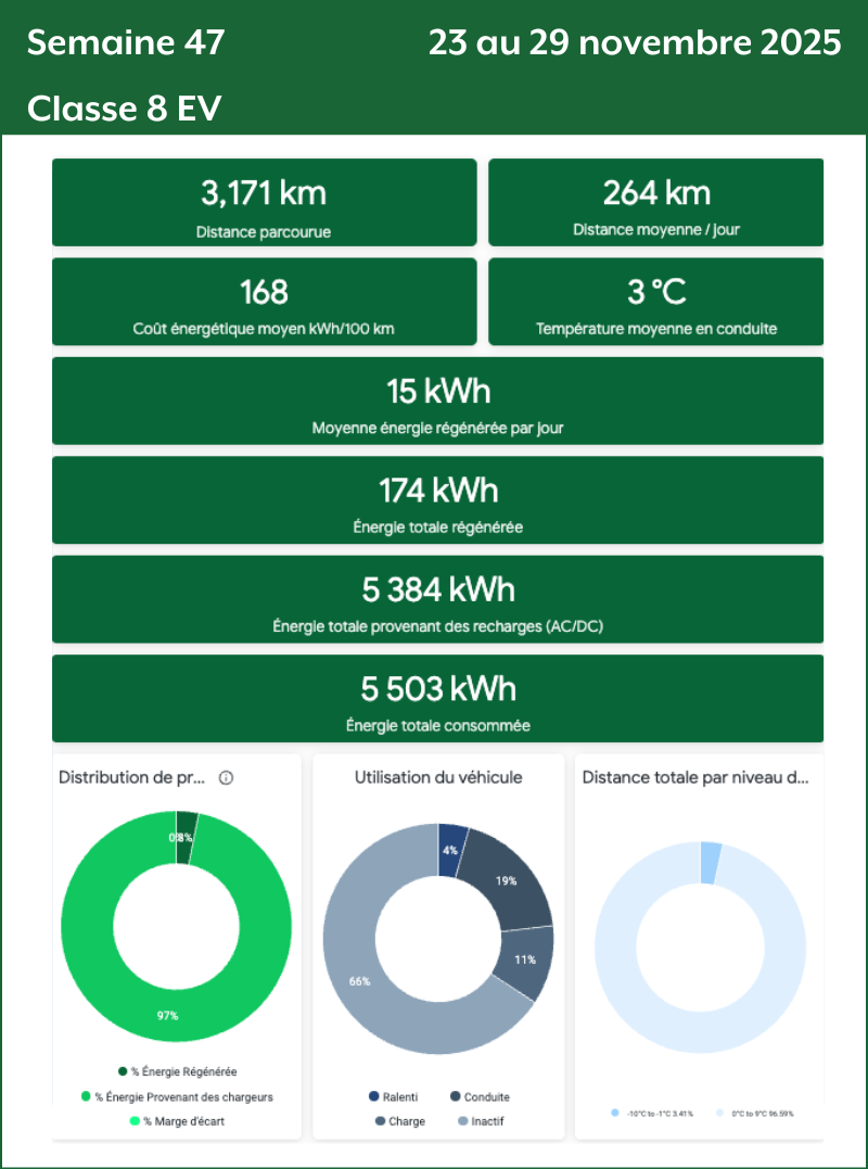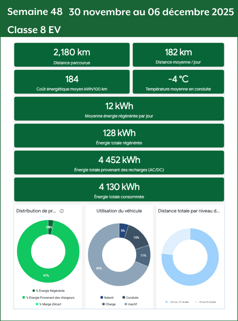 - Données classe 8 : Les données des camions de classe 8 sont transmises par Géotab à partir du 31 août 2025. Celles des mois de septembre, d’octobre et des deux premières semaines de novembre 2025 sont collectées uniquement sur le TE001. À partir de la mi-novembre 2025, les données proviennent des deux camions classe 8 (TE001 et TE002).
