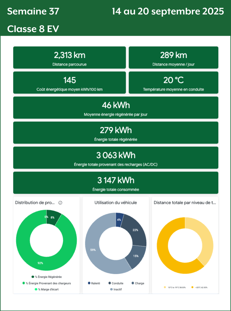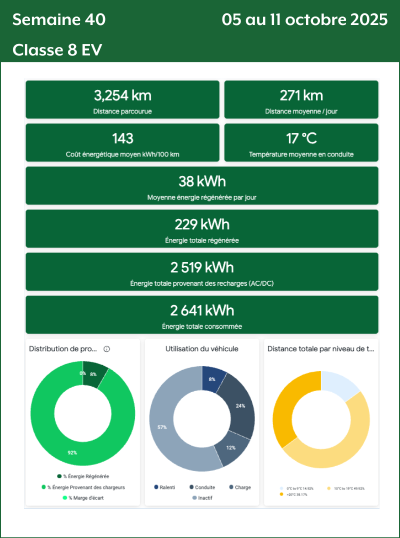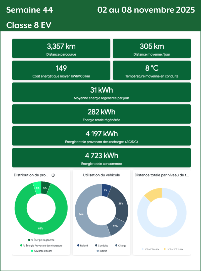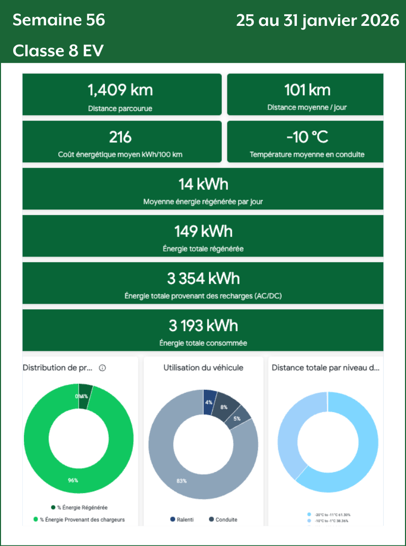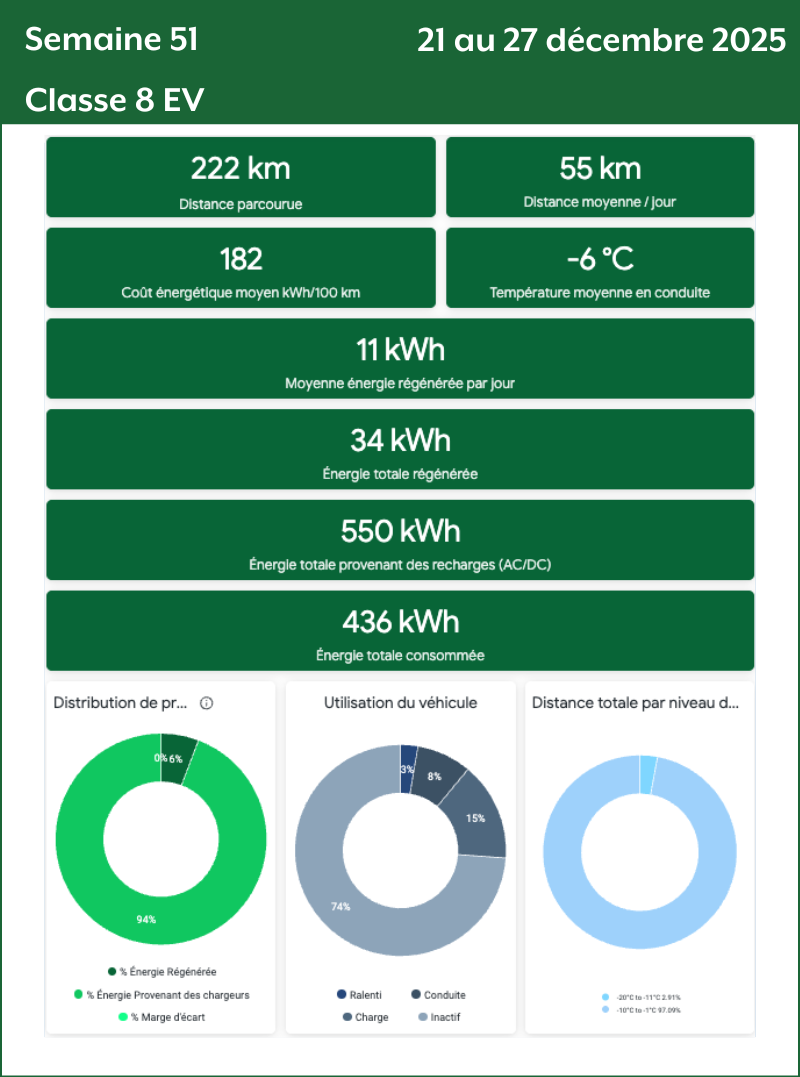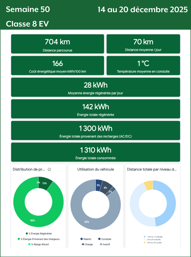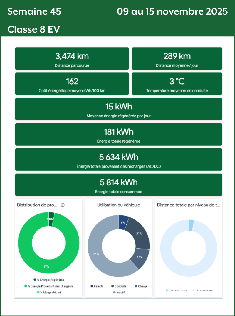 - Données classe 8 : Les données des camions de classe 8 sont transmises par Géotab à partir du 31 août 2025. Celles des mois de septembre, d’octobre et des deux premières semaines de novembre 2025 sont collectées uniquement sur le TE001. À partir de la mi-novembre 2025, les données proviennent des deux camions classe 8 (TE001 et TE002).