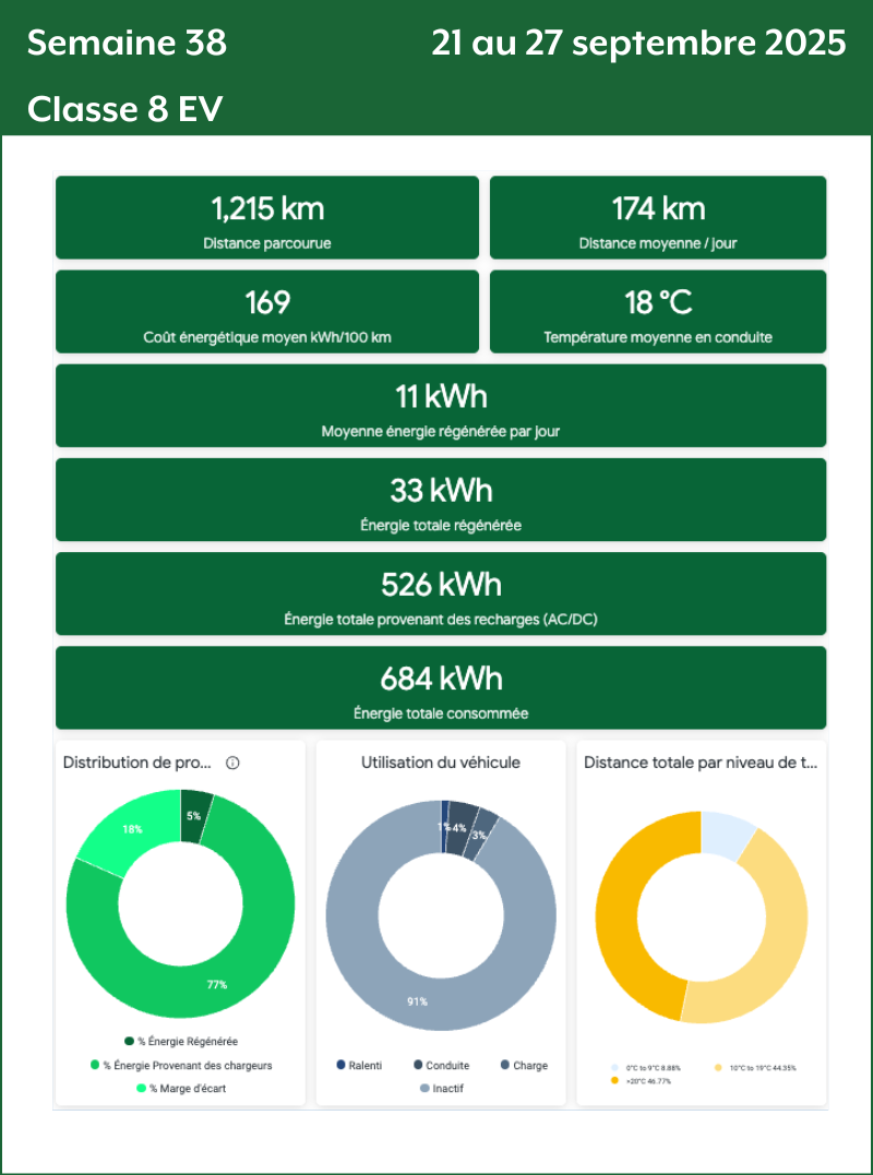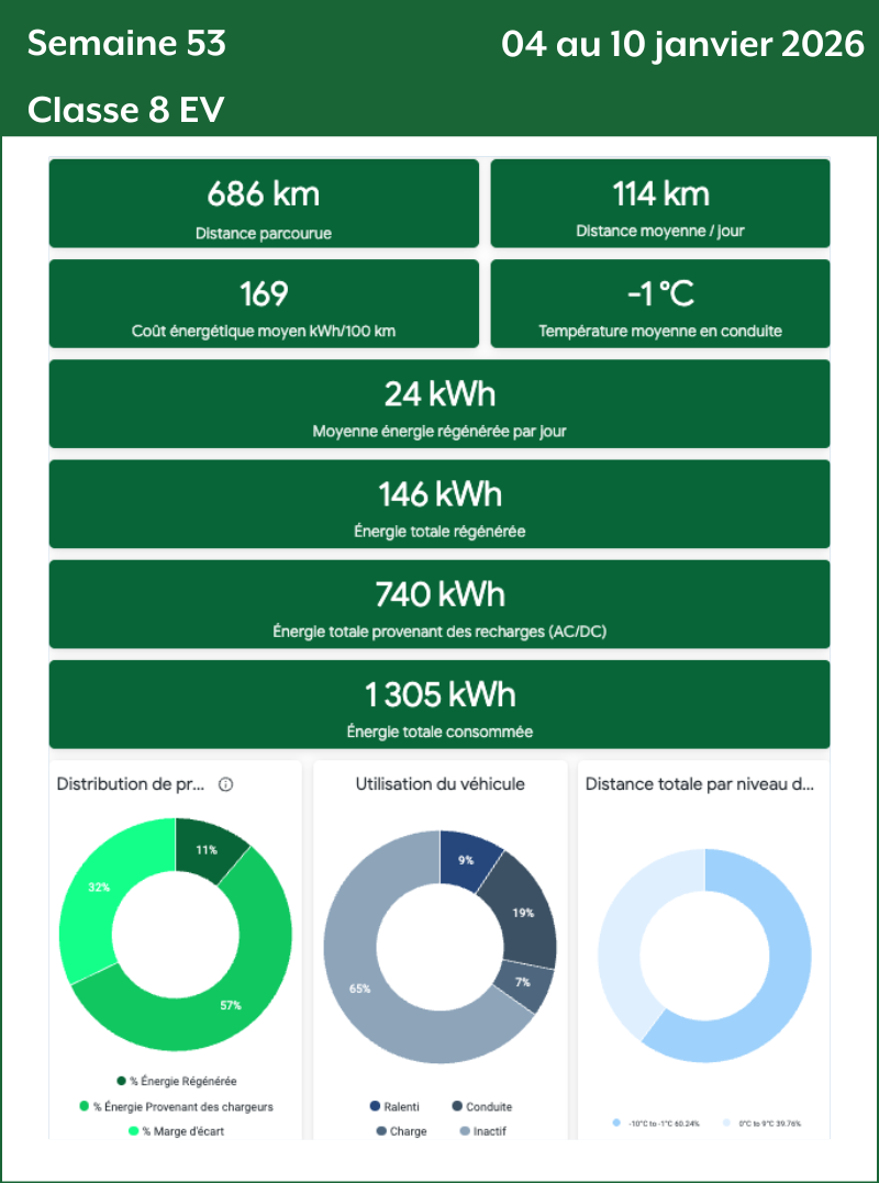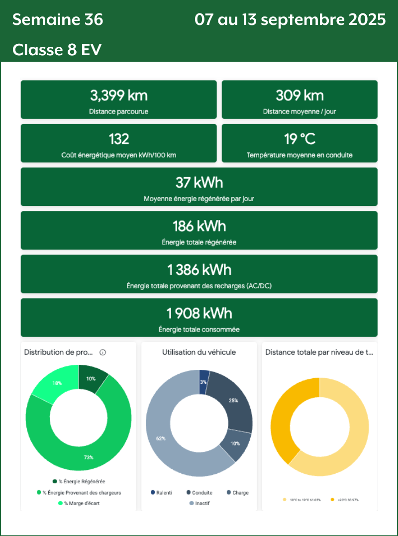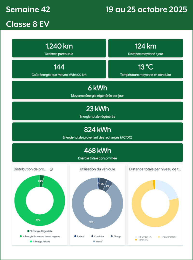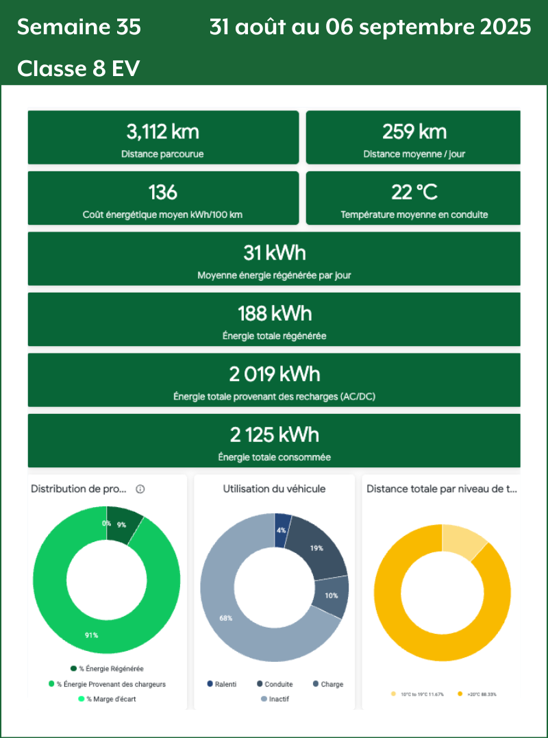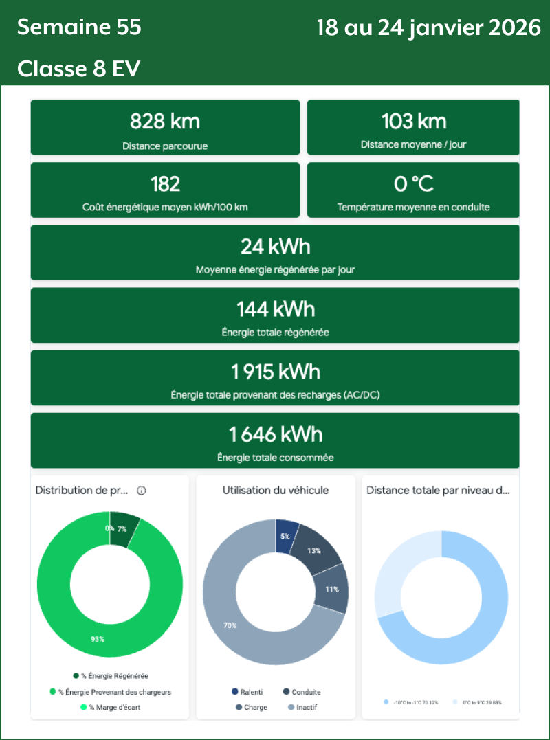 - Données classe 8 : Les données des camions de classe 8 sont transmises par Géotab à partir du 31 août 2025. Celles des mois de septembre, d’octobre et des deux premières semaines de novembre 2025 sont collectées uniquement sur le TE001. À partir de la mi-novembre 2025, les données proviennent des deux camions classe 8 (TE001 et TE002).