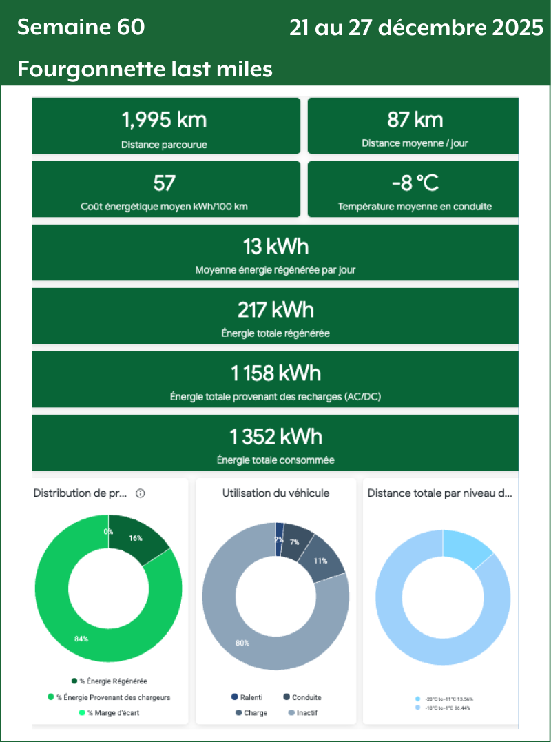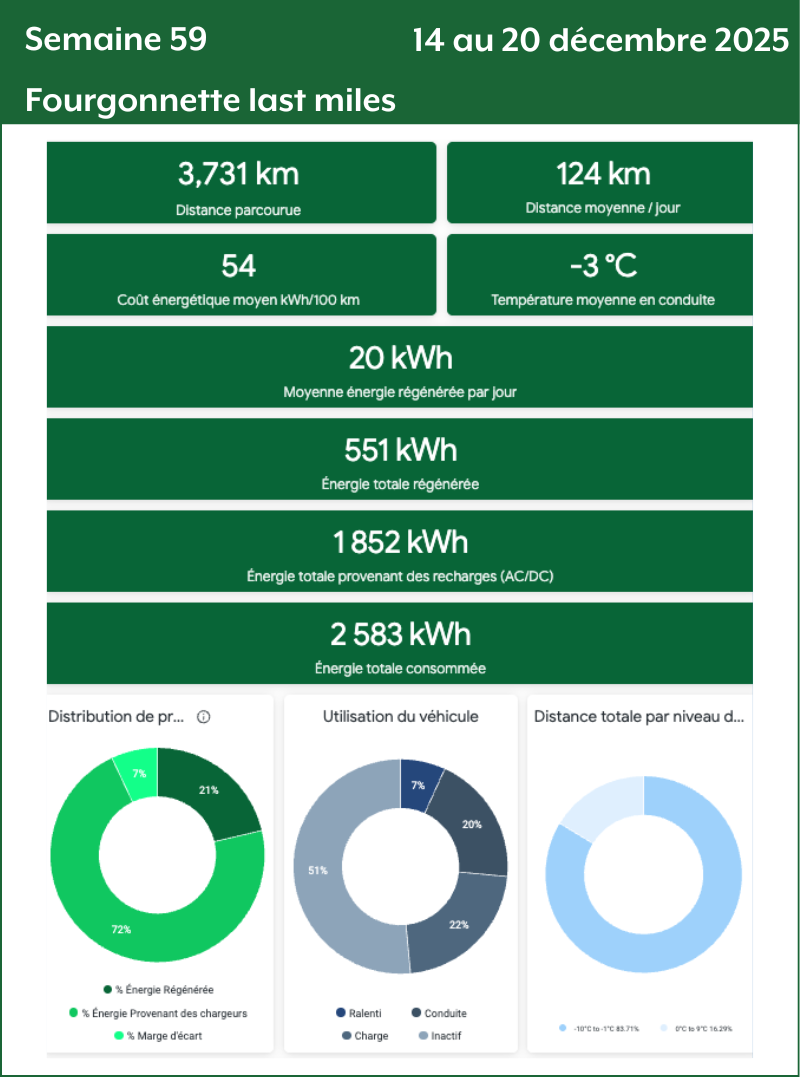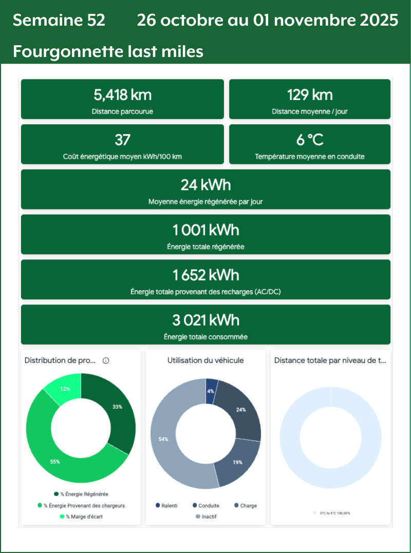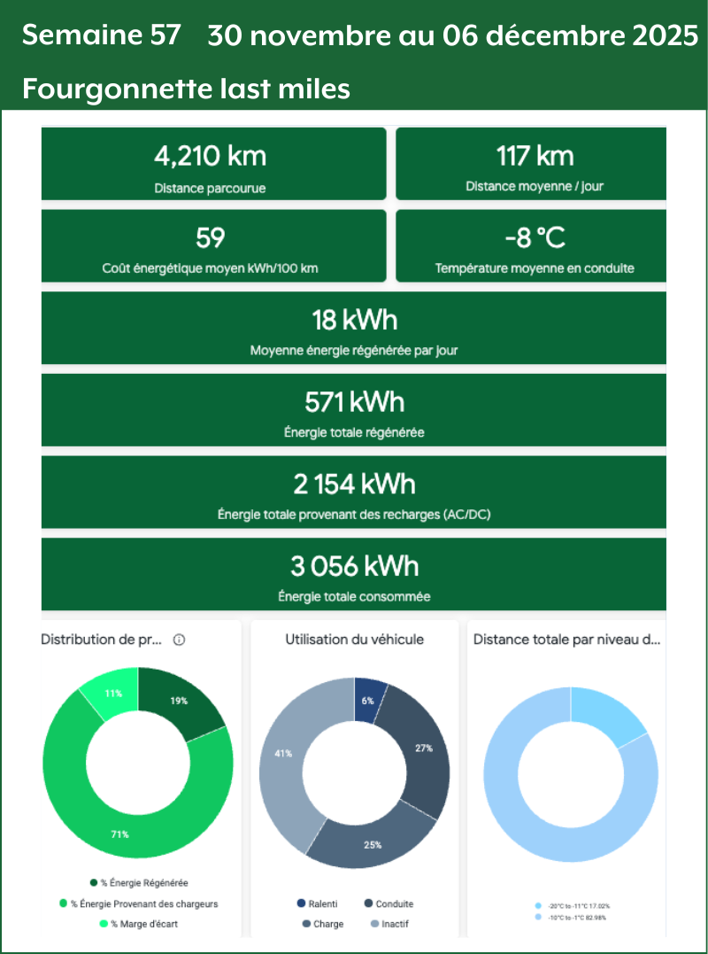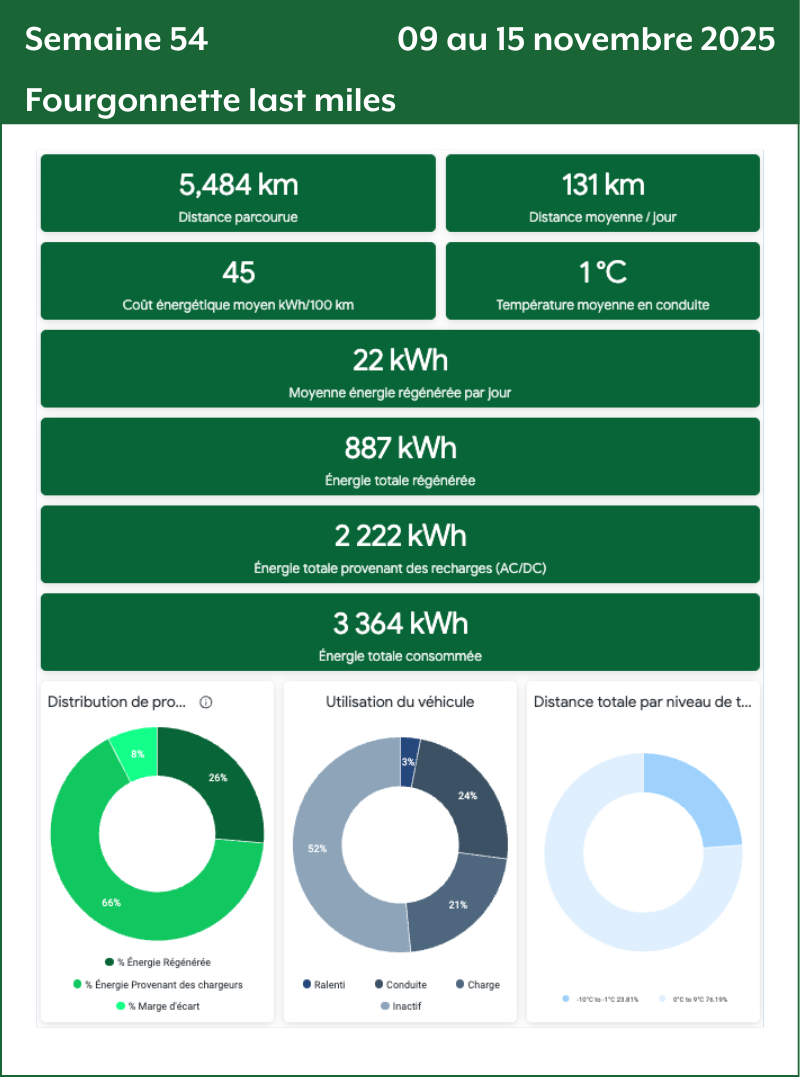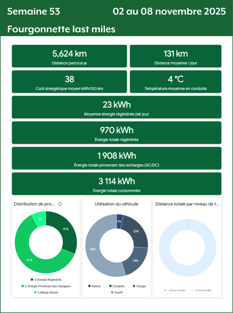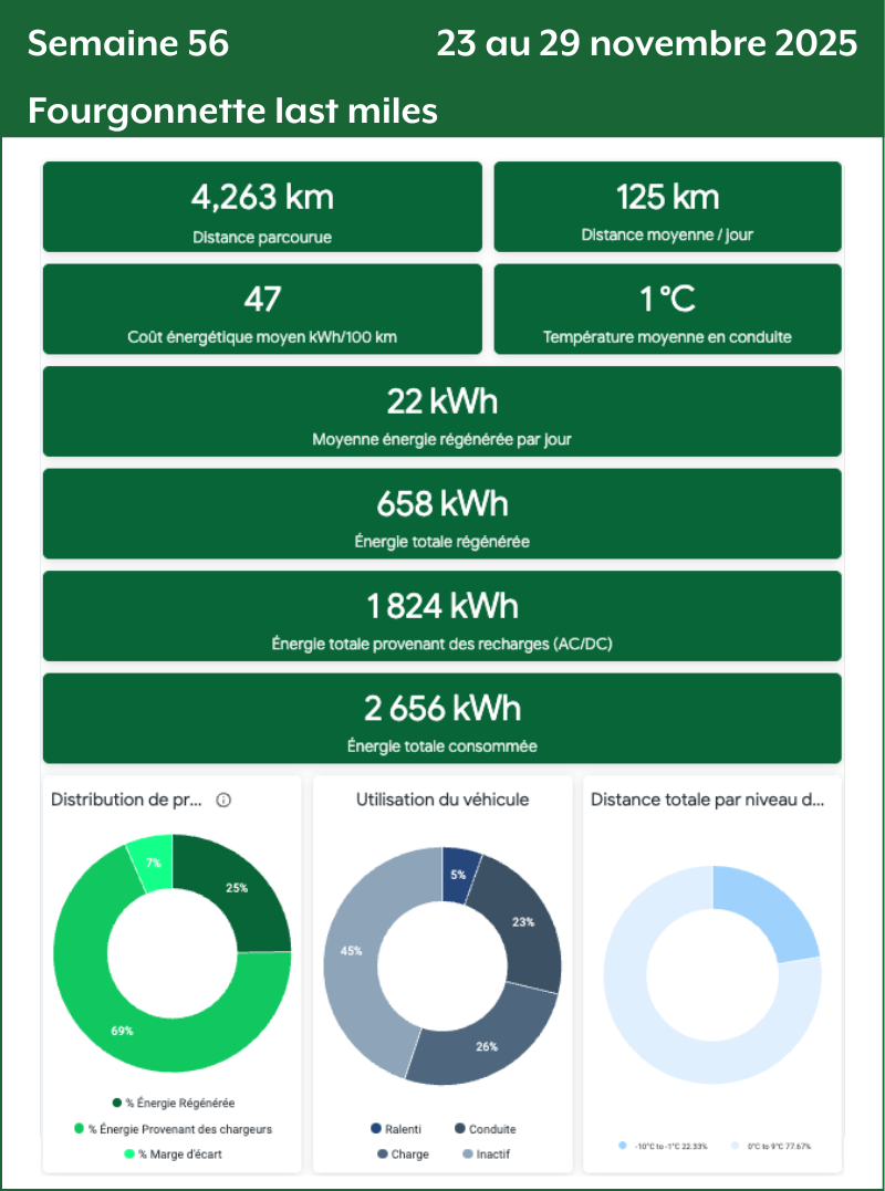 - Données classe 8 : Les données des camions de classe 8 sont transmises par Géotab à partir du 31 août 2025. Celles des mois de septembre, d’octobre et des deux premières semaines de novembre 2025 sont collectées uniquement sur le TE001. À partir de la mi-novembre 2025, les données proviennent des deux camions classe 8 (TE001 et TE002).