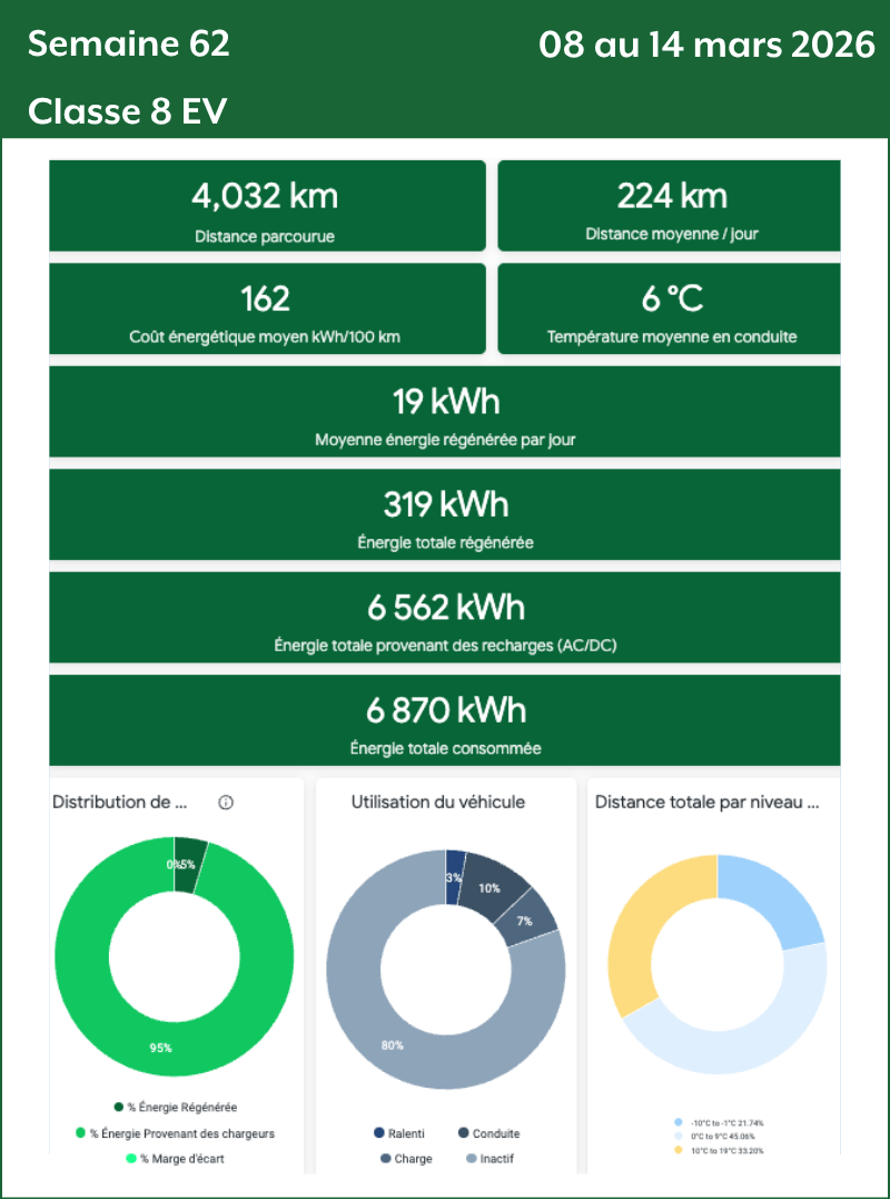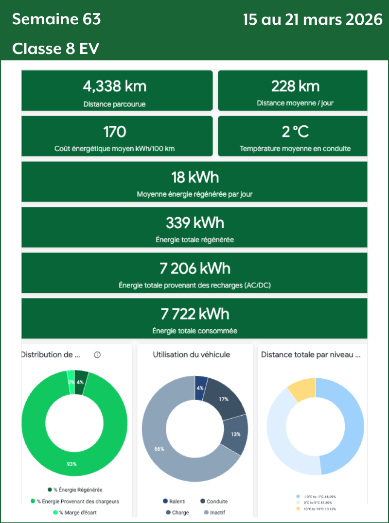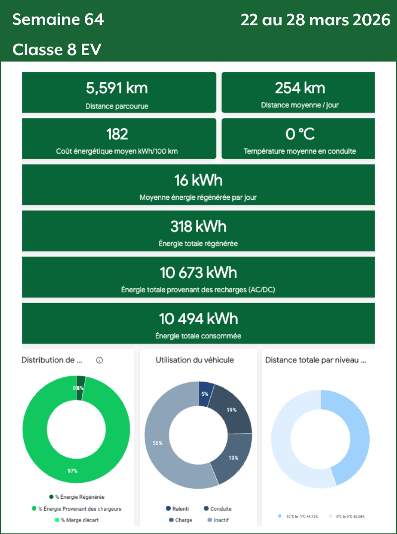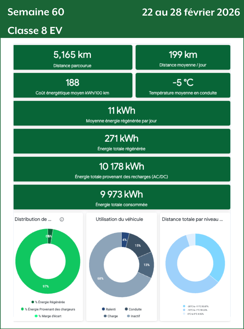 - Données classe 8 : Les données des camions de classe 8 sont transmises par Géotab à partir du 31 août 2025. Celles des mois de septembre, d’octobre et des deux premières semaines de novembre 2025 sont collectées uniquement sur le TE001. À partir de la mi-novembre 2025, les données proviennent des deux camions classe 8 (TE001 et TE002). Deux camions classe 8 (TE-407 et TE-408) ont été rajoutés en mi-décembre 2026 sur le corridor Québec-Montréal.